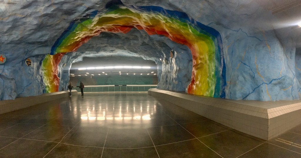 In Sweden the metro is called the Tunnelbana or T-bana. I have loved taking public transportation here because everything is so clean, efficient, and organized. For example, when you are waiting to get onto a bus or train, everyone waits in a single-file line, and then waits their turn to get onto the public transportation. I find this to be a very polite and orderly system. Also, the T-bana stations in Stockholm are said to be the world’s longest art exhibit! This just adds to the beauty of Stockholm’s transportation system. Below is a picture from the Stadion station.
